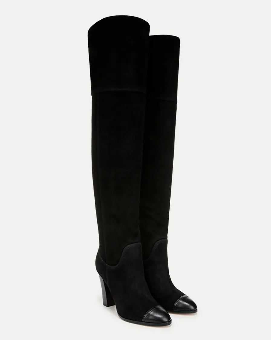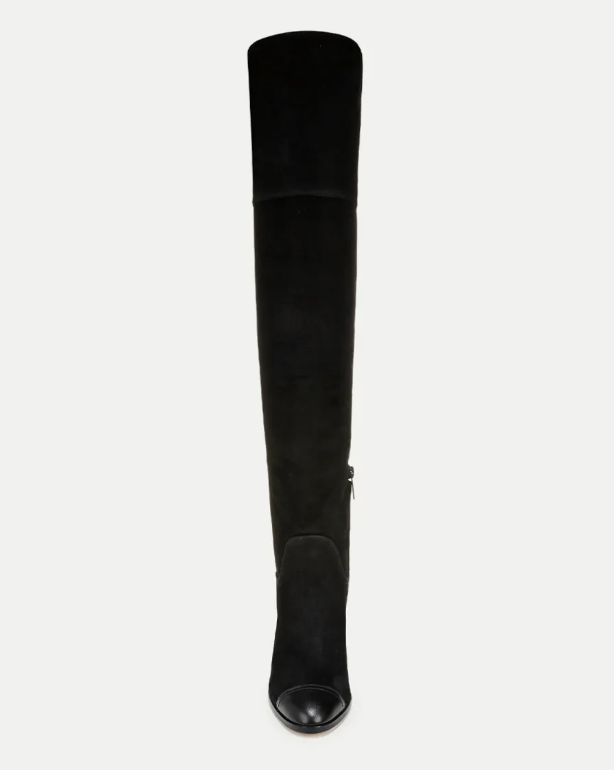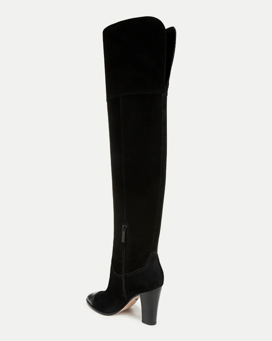 Crafted from smooth suede, this over-the-knee tall boot features an almond cap-toe and side zipper and elevates any look with ease.