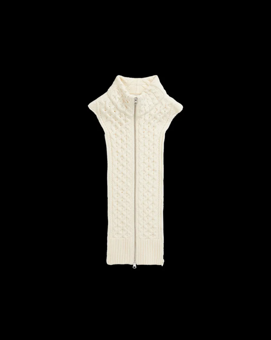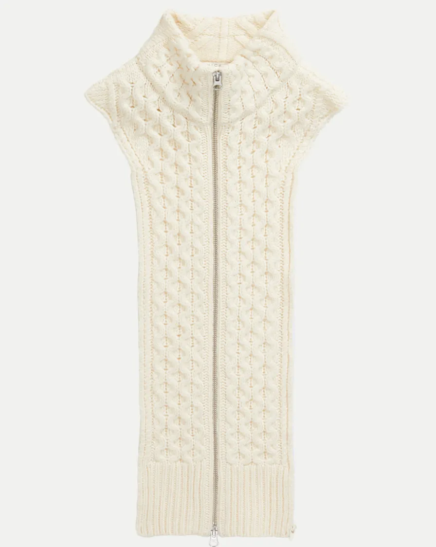 With a rustic cable stitch in soft merino wool and a two way front zipper, this is the ultimate layering option.