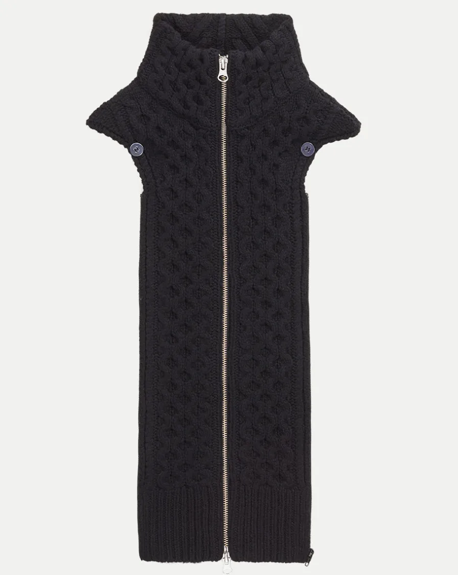With a rustic cable stitch in soft merino wool and a two way front zipper, this is the ultimate layering option.