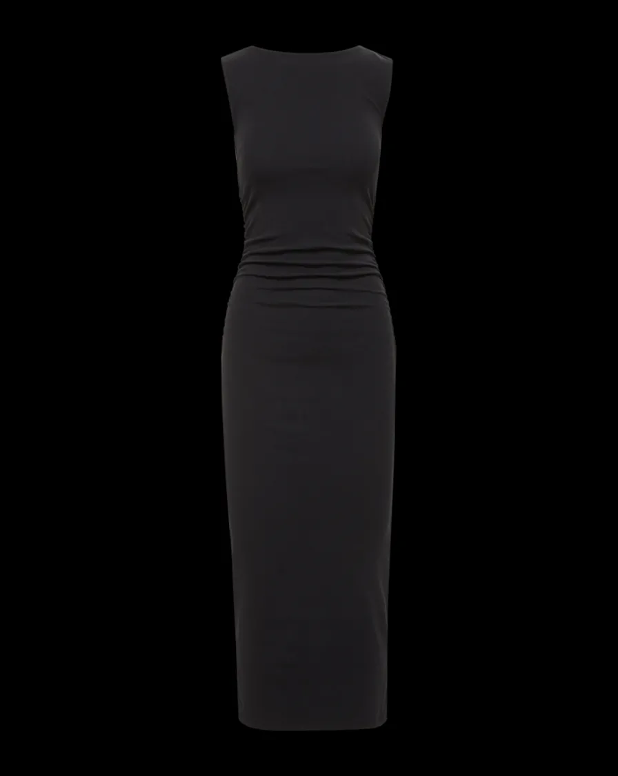 This sultry bodycon maxi dress boasts figure-flattering stretch, ruching down the sides and an elegant boat neckline.