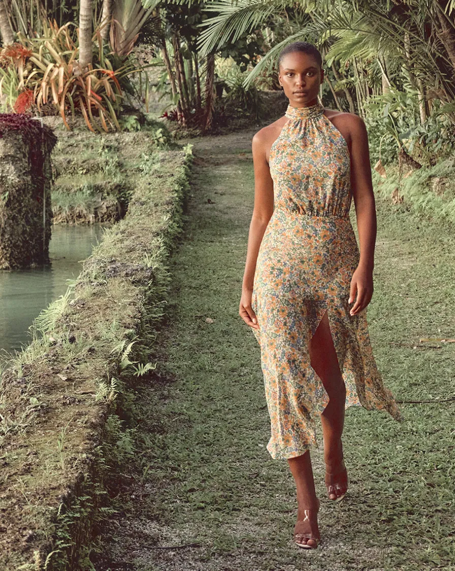 The halter neckline and semi-sheer handkerchief skirt complete the look of this going-out style.