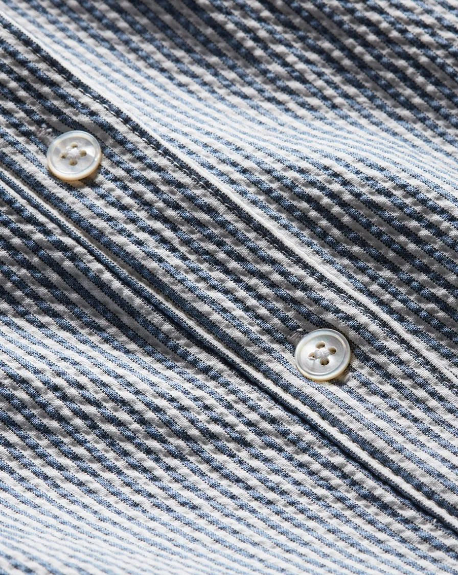 from stretch-cotton seersucker, the Mackey is an A-line shirtdress with a halter neckline and neat collar.