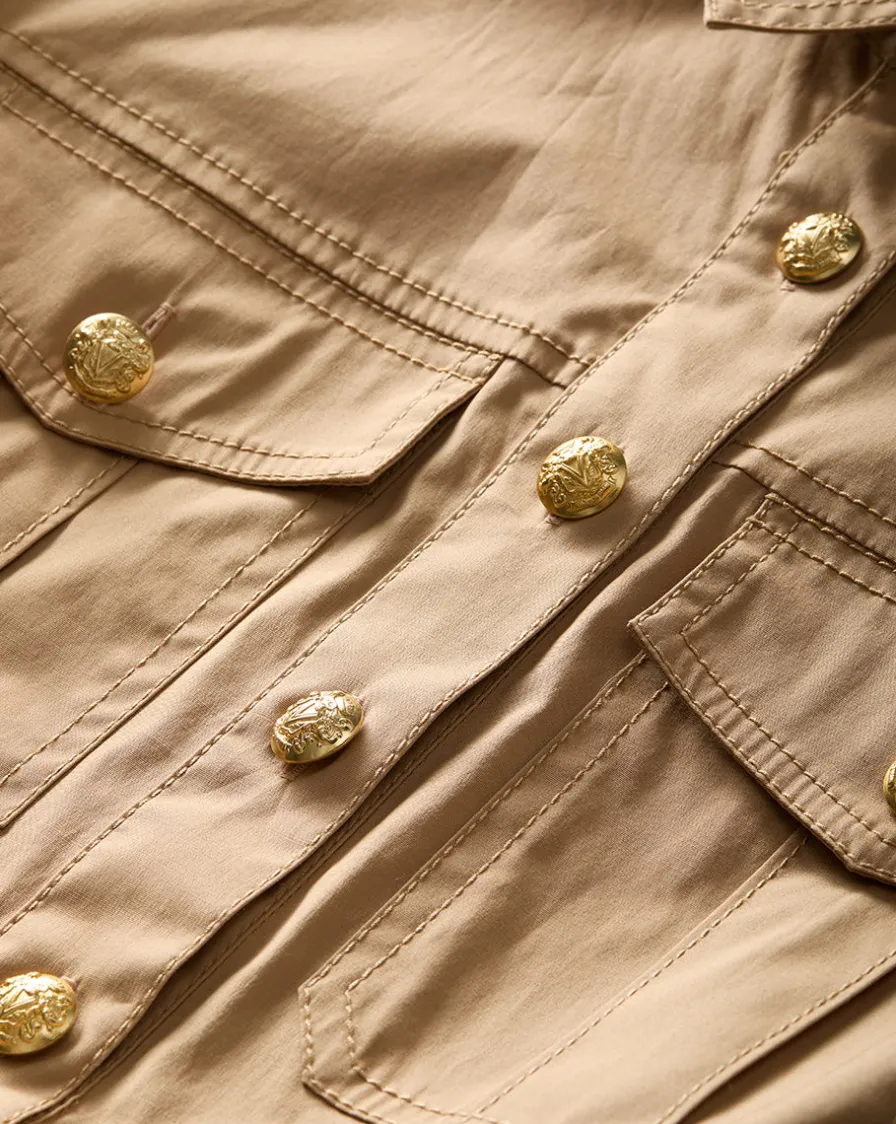 It’s finished with a neat collar, a button-down placket and four patch pockets.