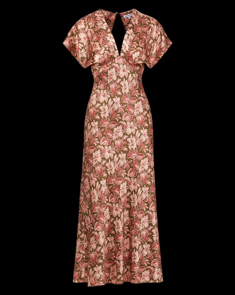 Crafted from lustrous stretch-silk with a fluid drape, it features a deep V-neckline and keyhole back to show a glimpse of skin.