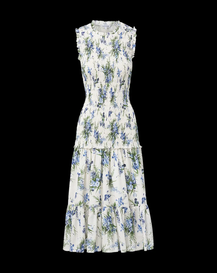Cut in crisp 100% cotton, its body-hugging smocked bodice elongates through the dropped waist, giving way to a breezy tiered midi skirt with dainty ruffles along the hem, neckline and sleeves.