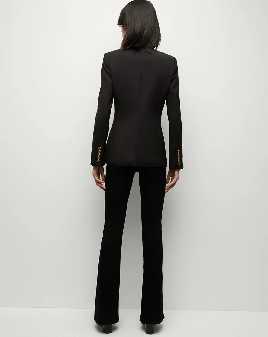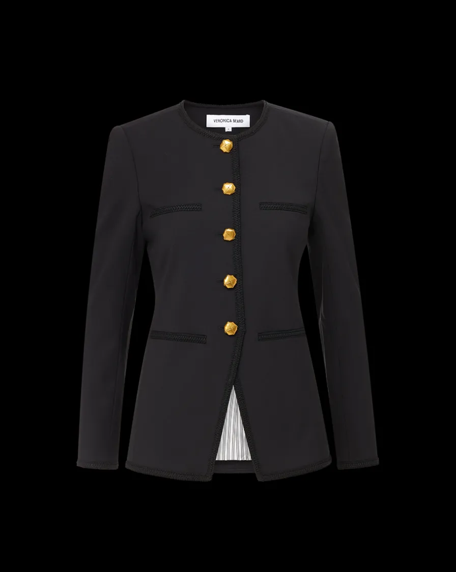 Expertly tailored from stretch virgin wool, the Alessia features a collarless, nipped-waist silhouette and an angled cutaway hem.