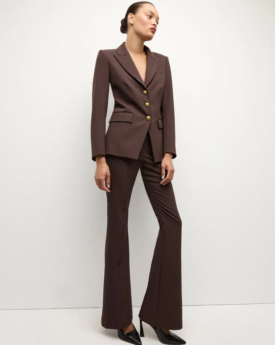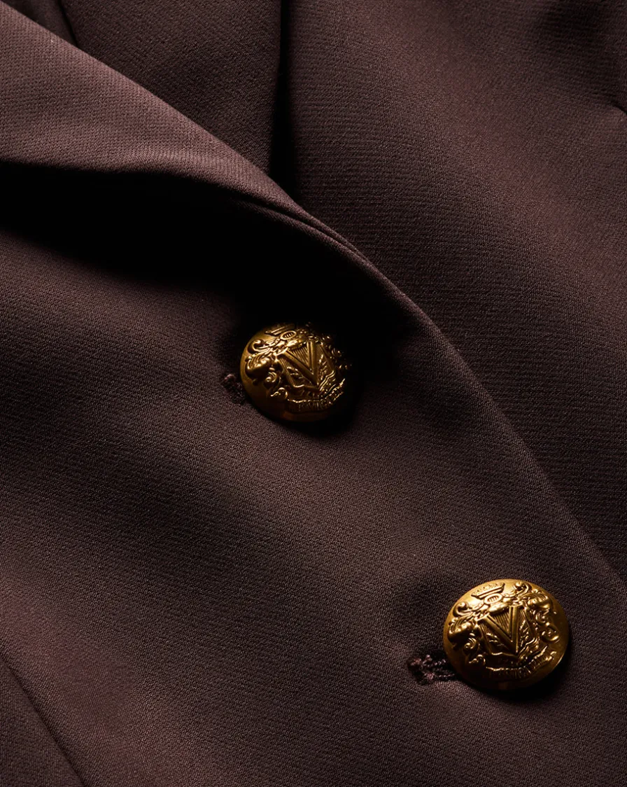 The dark chocolate color, punctuated by gold crest buttons, makes this a versatile closet hero.