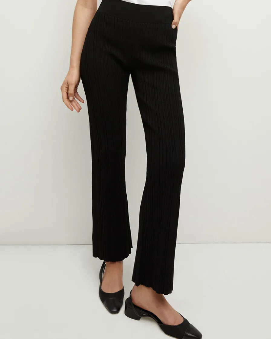 The ease of leggings in a sleek and streamlined pant… Expertly spun from a soft yet structured stretch knit, the Massaro features a skinny-flare leg that’s fitted through the hips and thighs while the textured ribbing further elongates the legs.