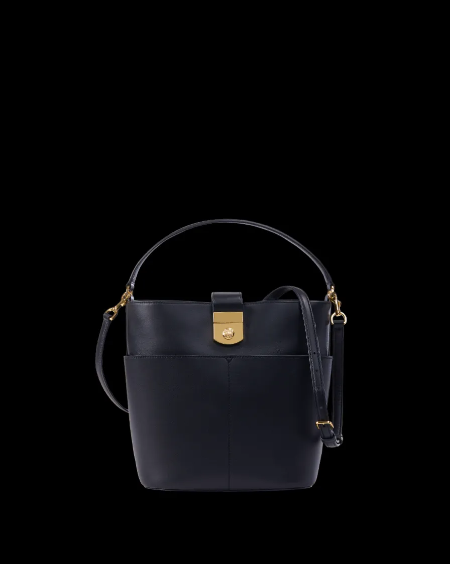 A petite take on the original’s chic, sculptural shape, the small Crest Lock Bucket Bag is crafted from supple leather and finished with a crest-lock closure.