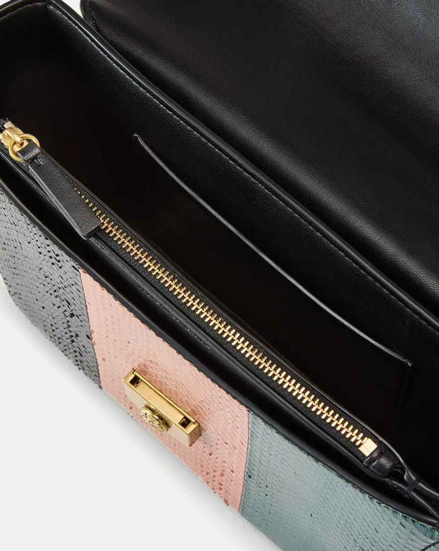 A compact companion with enough room for everything, this bag is defined by a color-blocked patchwork of snakeskin and finished with sleek hardware.