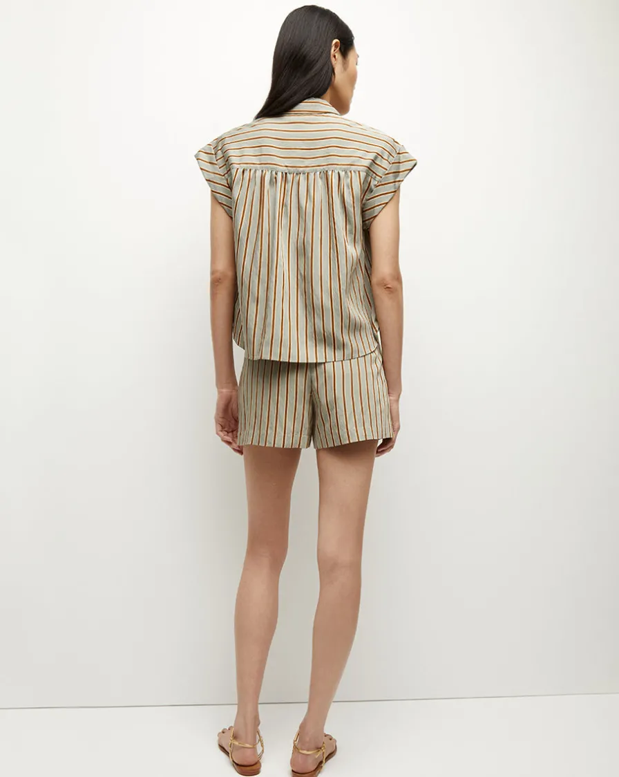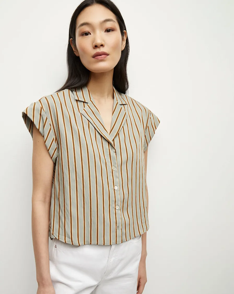 Great on its own or as a layering essential, this effortless button-down is thoughtfully constructed with a notched lapel, wide cap sleeves and roomy armholes.