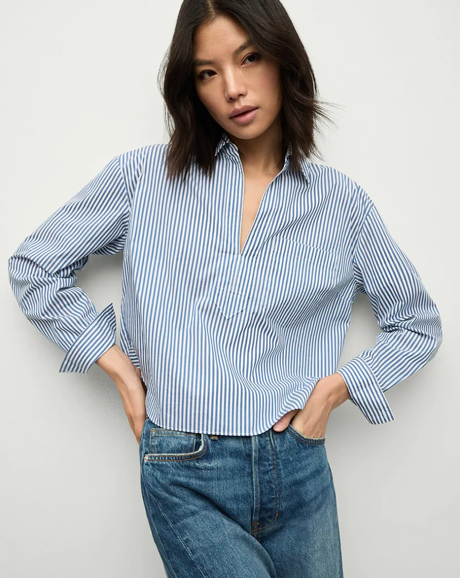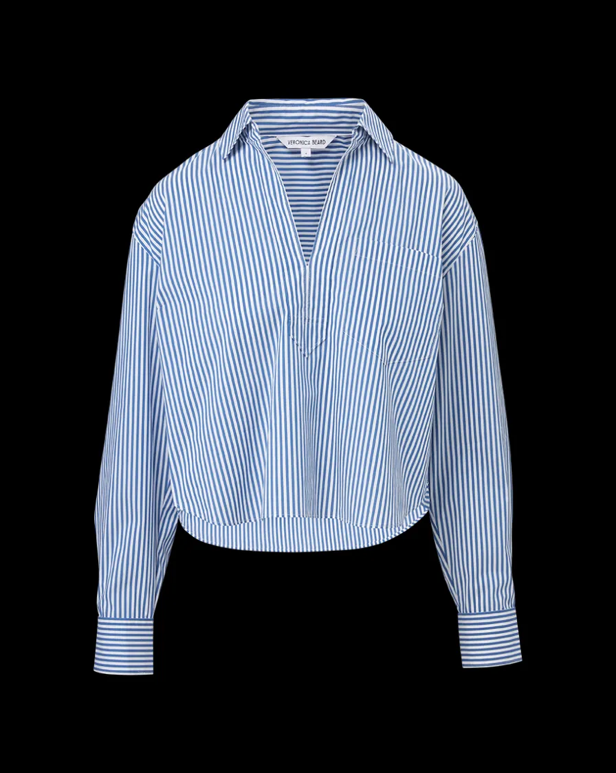 Veronica Beard Tops>Khai Cropped Tunic Top in Blue/White Stripe