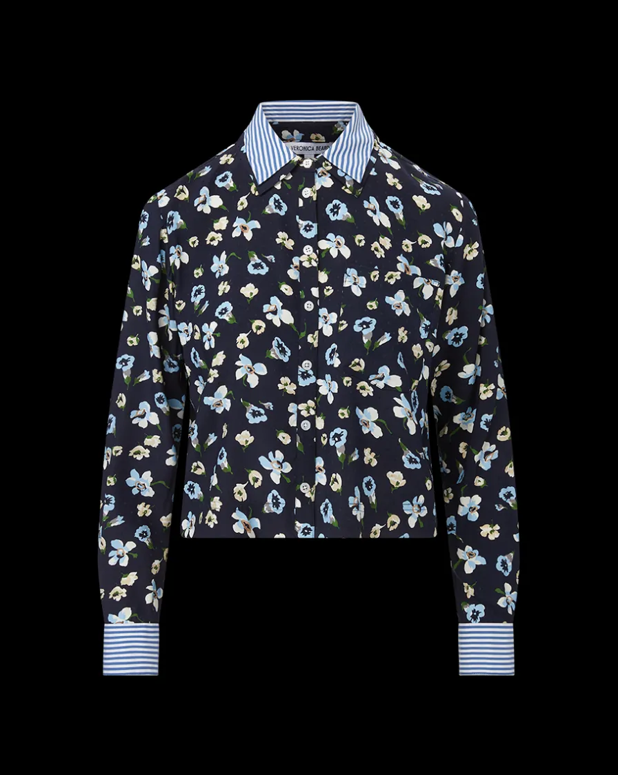Feminine meets masculine in the Maia, which contrasts beautiful watercolor florals with a second striped collar and matching cuffs.