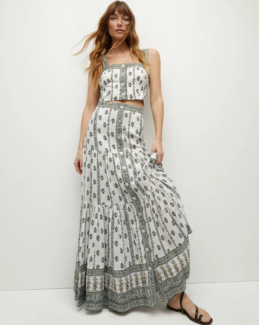 Pair with wide-leg jeans and platform clogs or wear with the matching skirt for the polished look of a dress.
