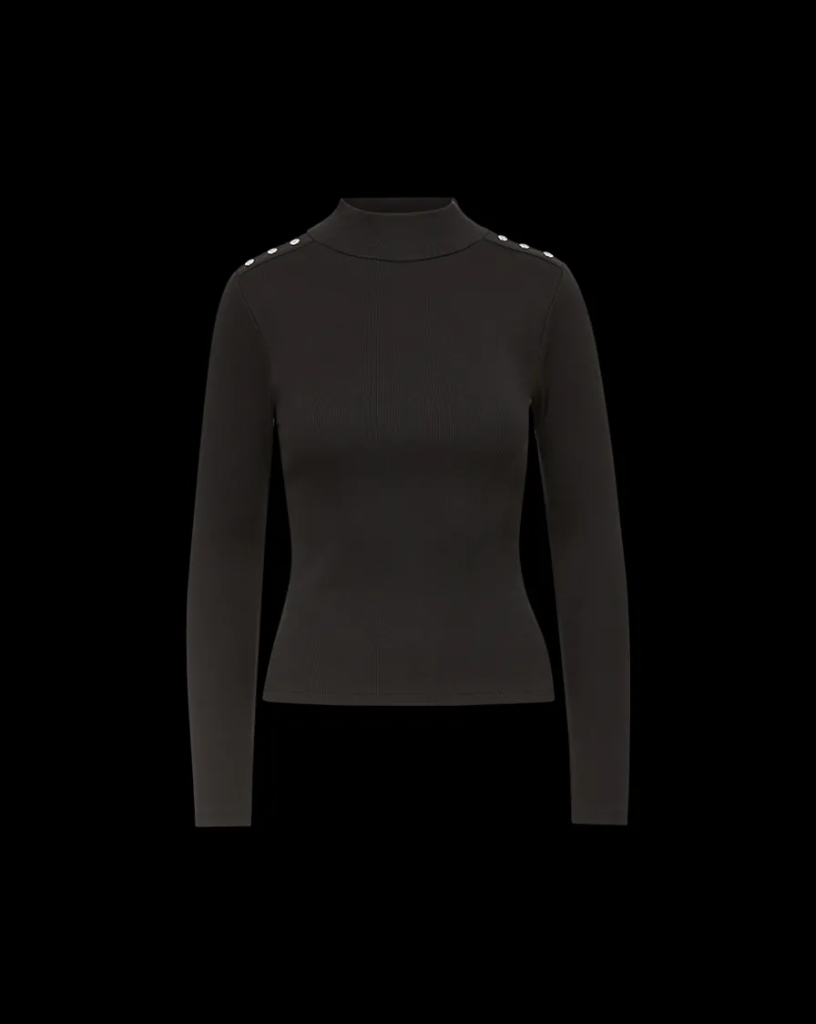 Made from premium stretch cotton, the Nate is defined by a slim fit, a mock neck, and button embellishments on the shoulder.