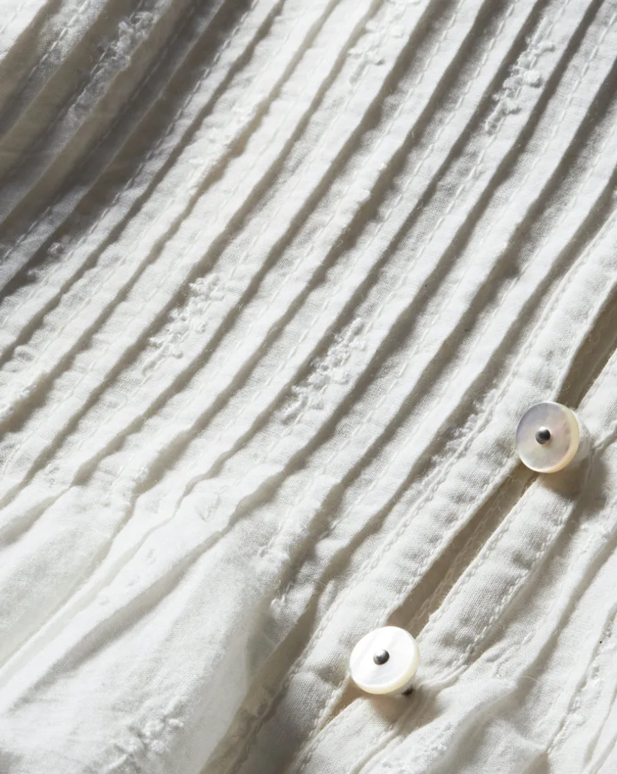 Intricate pin-tucks at the yoke and tonal embroidery, meanwhile, add texture and visual intrigue.