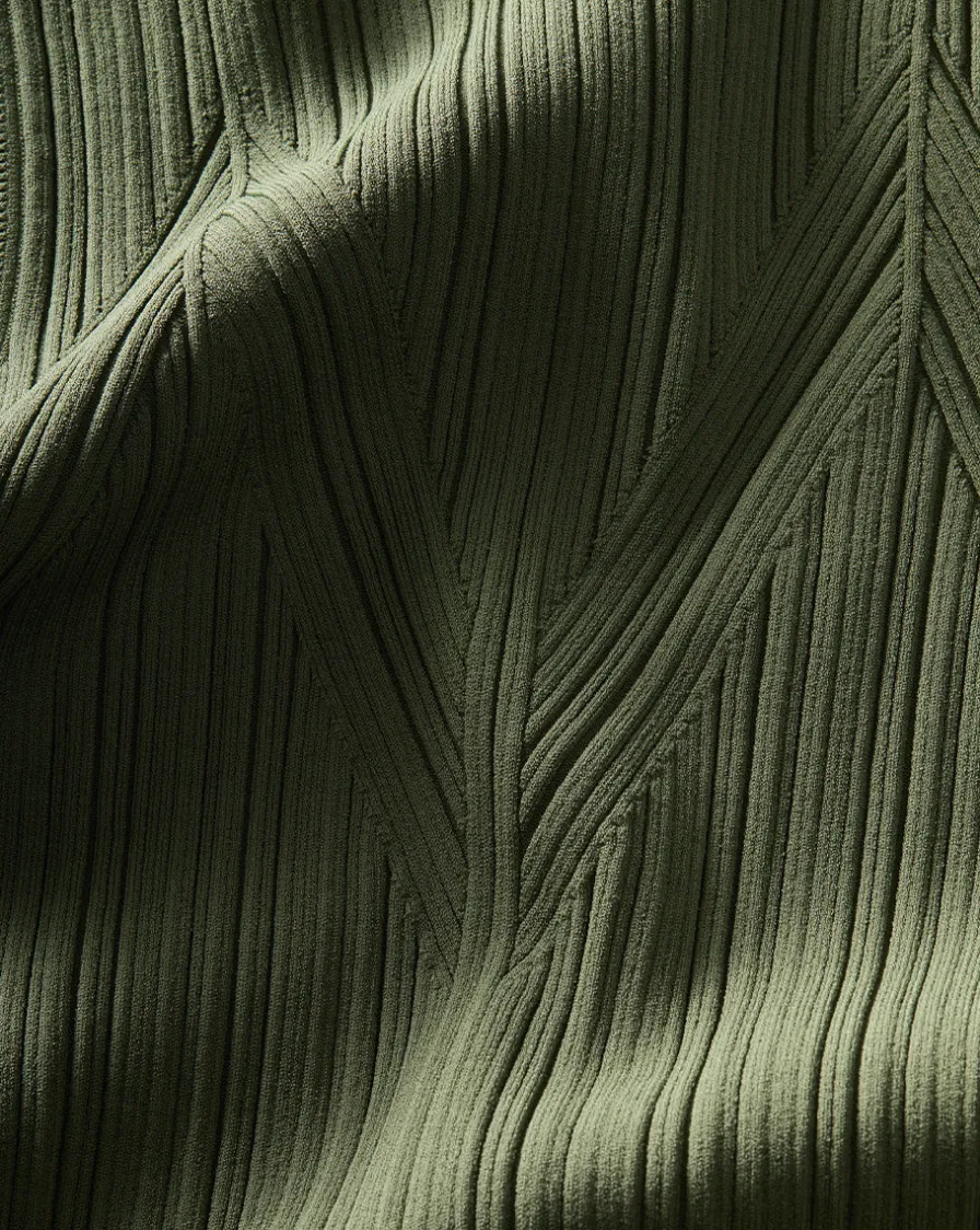 Spun from a sporty stretch knit, the Semma features vertical ribbing and architectural seaming at the waist for a slight peplum effect.