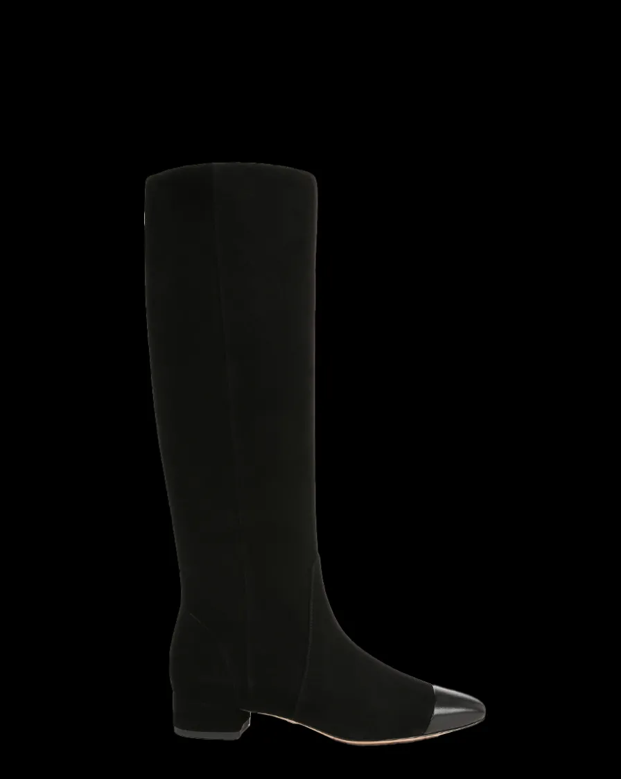 Expertly crafted from luxe suede, this knee high, cap-toe boot style features a tapered square toe and a low one-inch block heel for easy support.