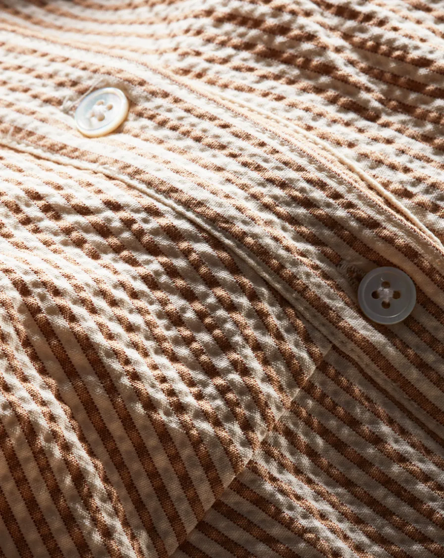 from stretch-cotton seersucker, the Mackey is an A-line shirtdress with a halter neckline and neat collar.