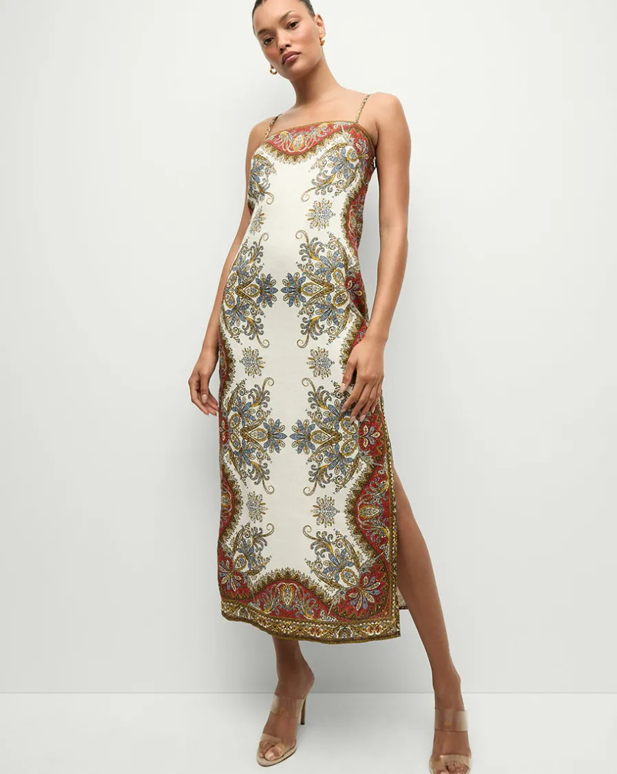Made from lightweight linen, the Petra maxi dress contrasts a clean, streamlined slip silhouette with a beautiful ornamental floral—a winning combination for both ease and elegance.