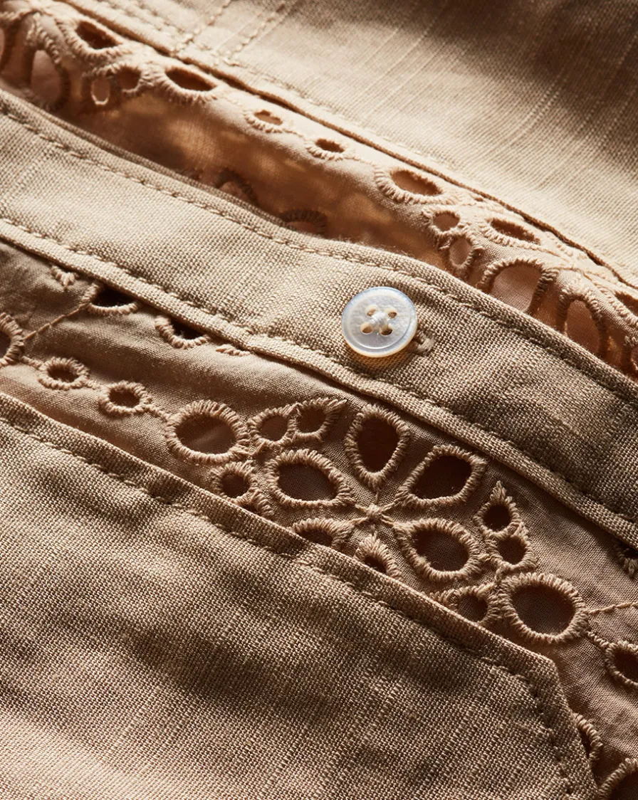 Its airy eyelet body lends femininity to the boxy silhouette, while a neat collar and cargo patch pockets offer a cool utilitarian modernity.