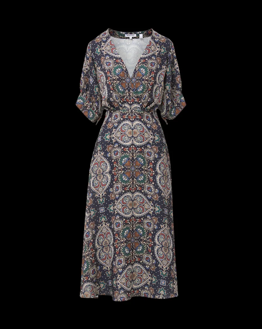 An effortlessly chic midi, the V-neck Wyatt features a cinched-in waist and a kaleidoscopic bohemian print.