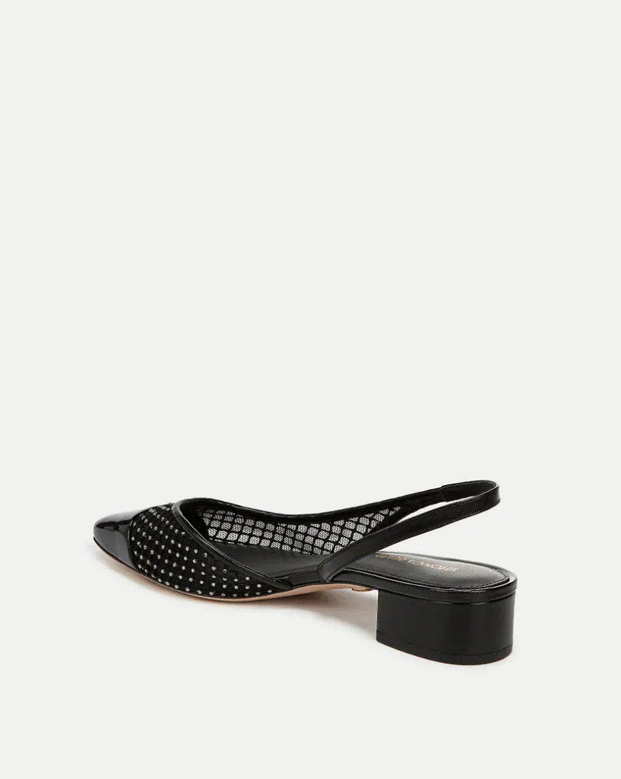 Now in a semi-sheer mesh fabrication with chic rhinestones and tapered square toe, this timeless style features a low one-inch block heel for easy support and an elasticized strap for comfort.