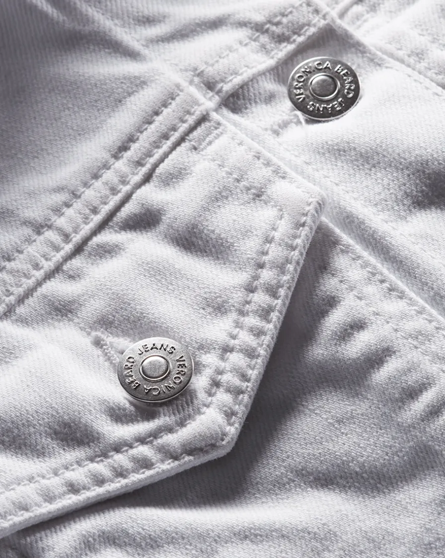 With strong shoulders and a cropped silhouette, this directional piece makes a statement and the bright-white wash makes it perfect for spring and summer.