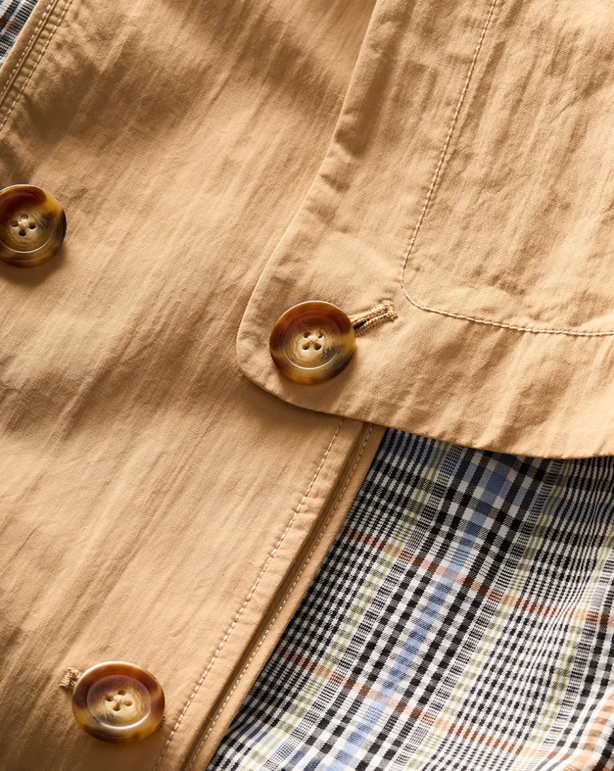 The core design details are there—buckled cuffs, a storm flap and a buttoned storm vent in the back—but we’ve added panels of plaid for a chic patchwork effect.