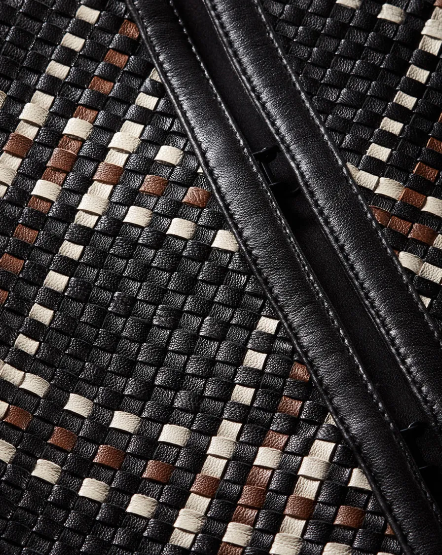 A master class in craftsmanship, the Cassandra is a classic lady jacket made from woven lambskin leather.