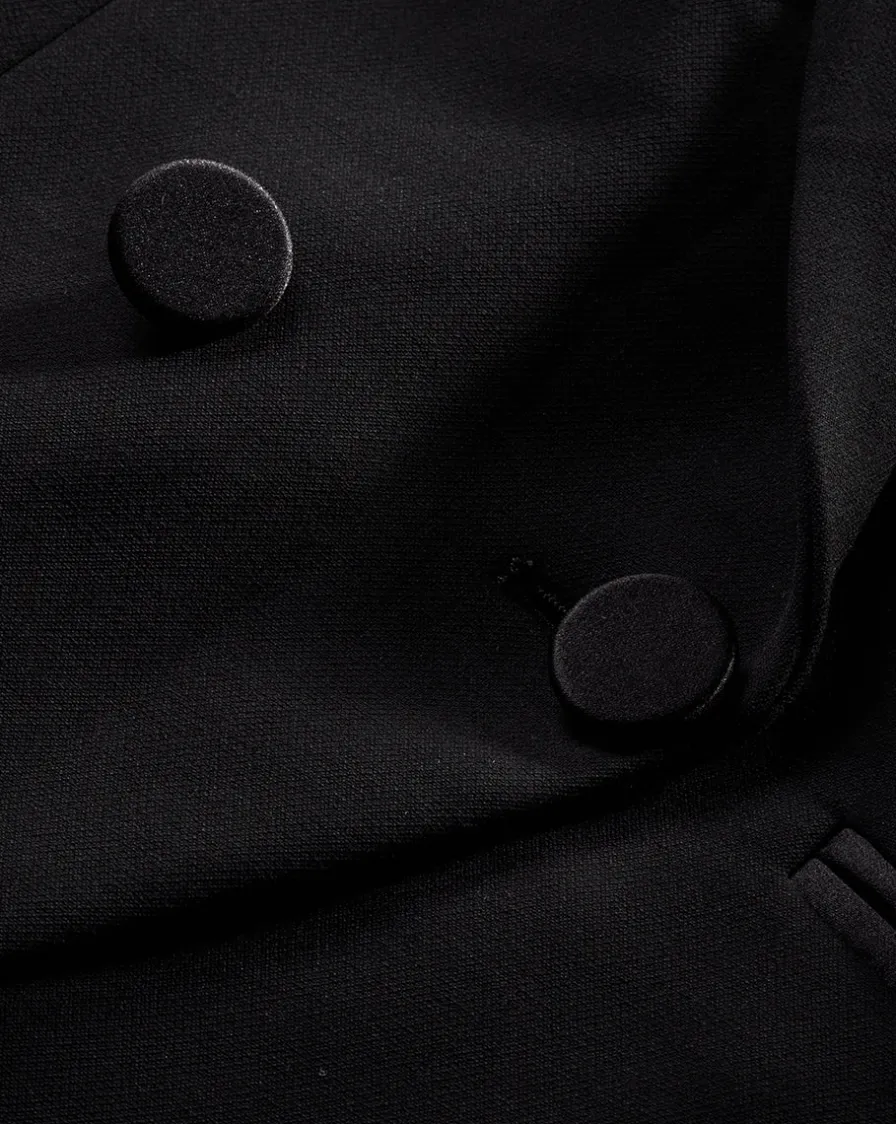 Expertly tailored in the US, this double-breasted style is defined by an angled cutaway hem and diagonal welt pockets.
