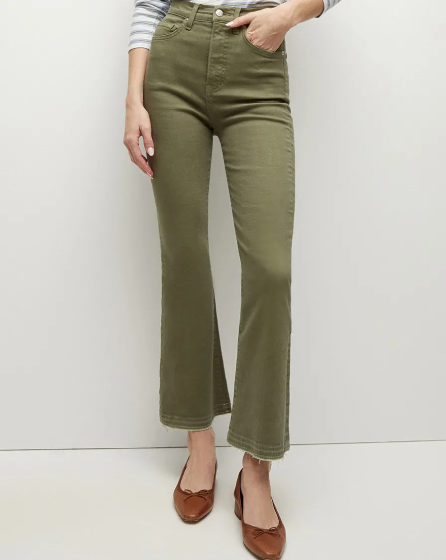Meet the Carson, our classic high-rise flare, updated in an army-green wash and a let-down hem.