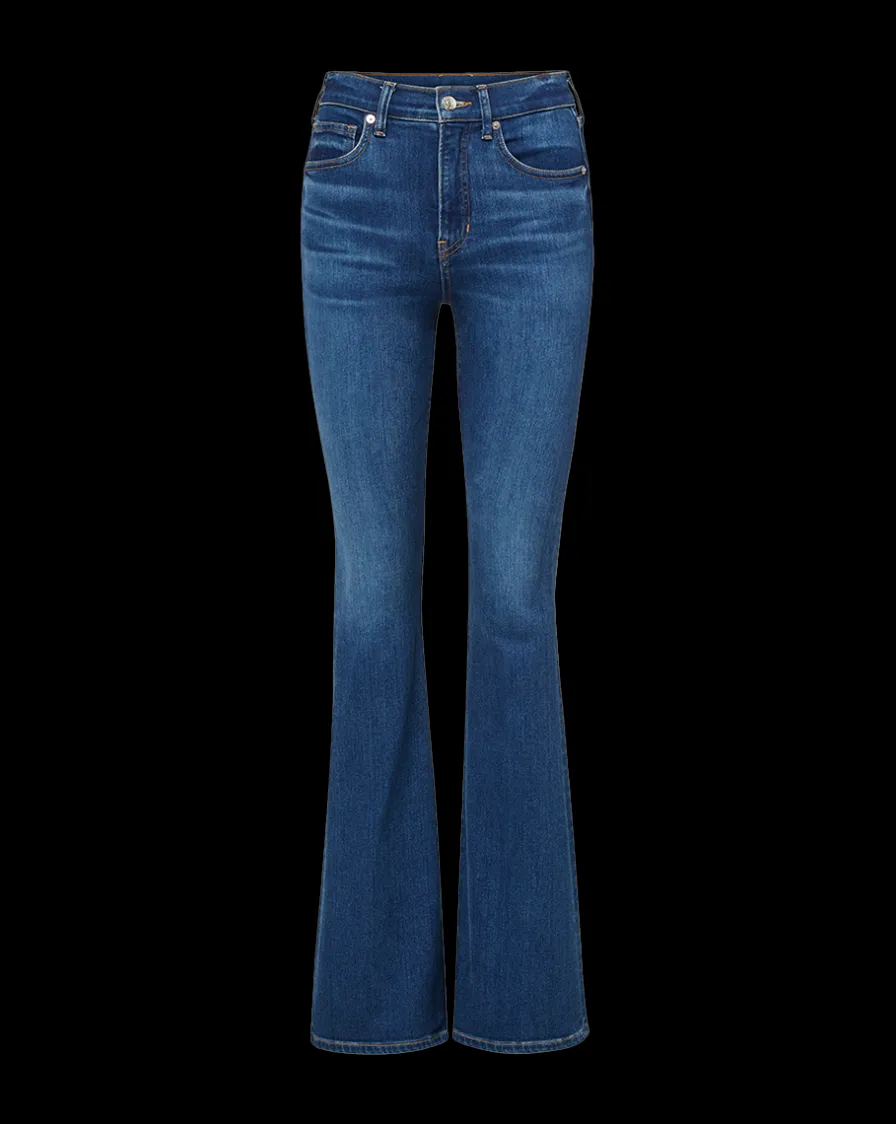 In a classic blue wash, the Beverly jean features a high-rise waist that is fitted through the hips and thighs with a subtly flared leg.