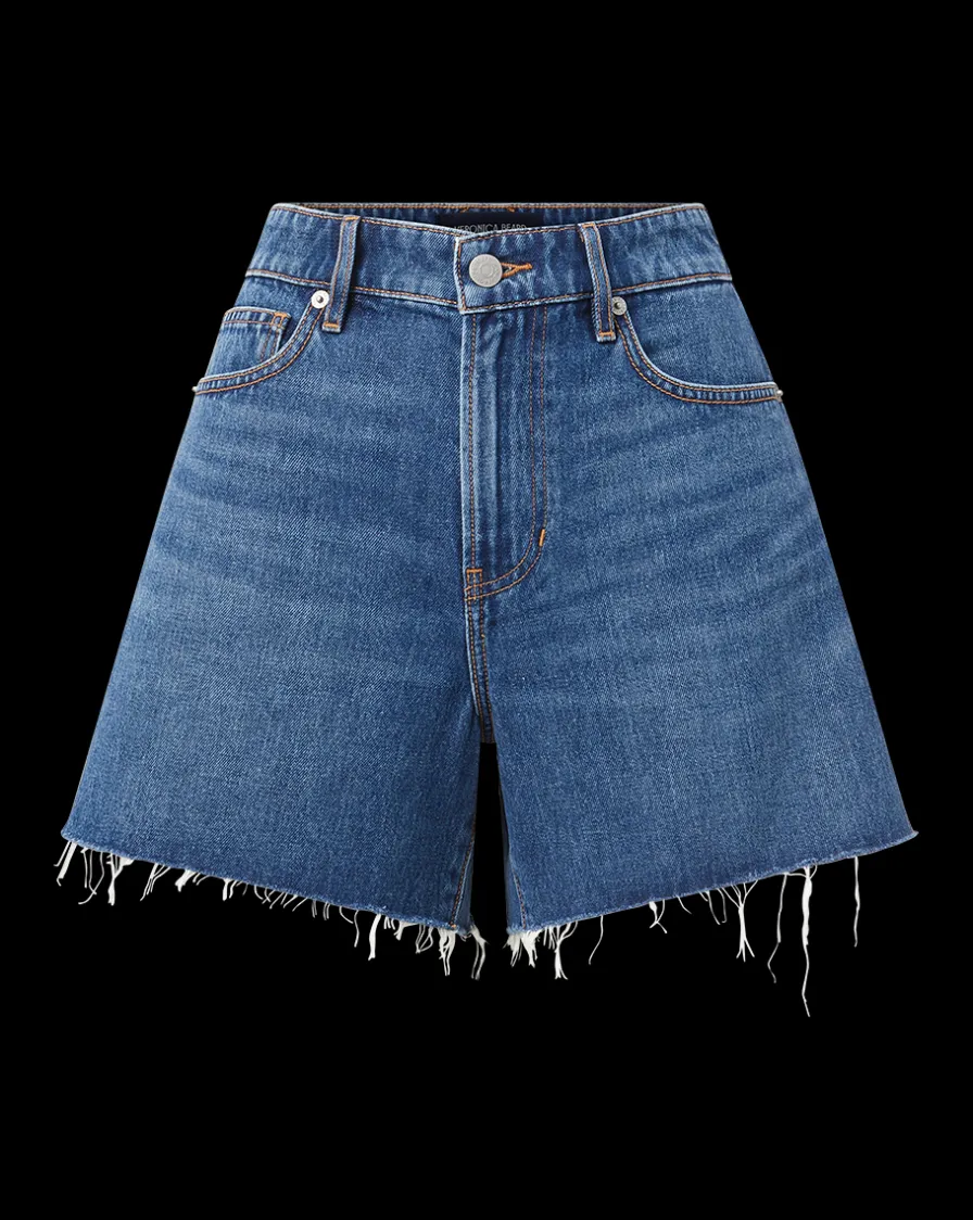 This mid-length, high-rise style is finished with a raw hem, button fly, and classic five-pocket styling.