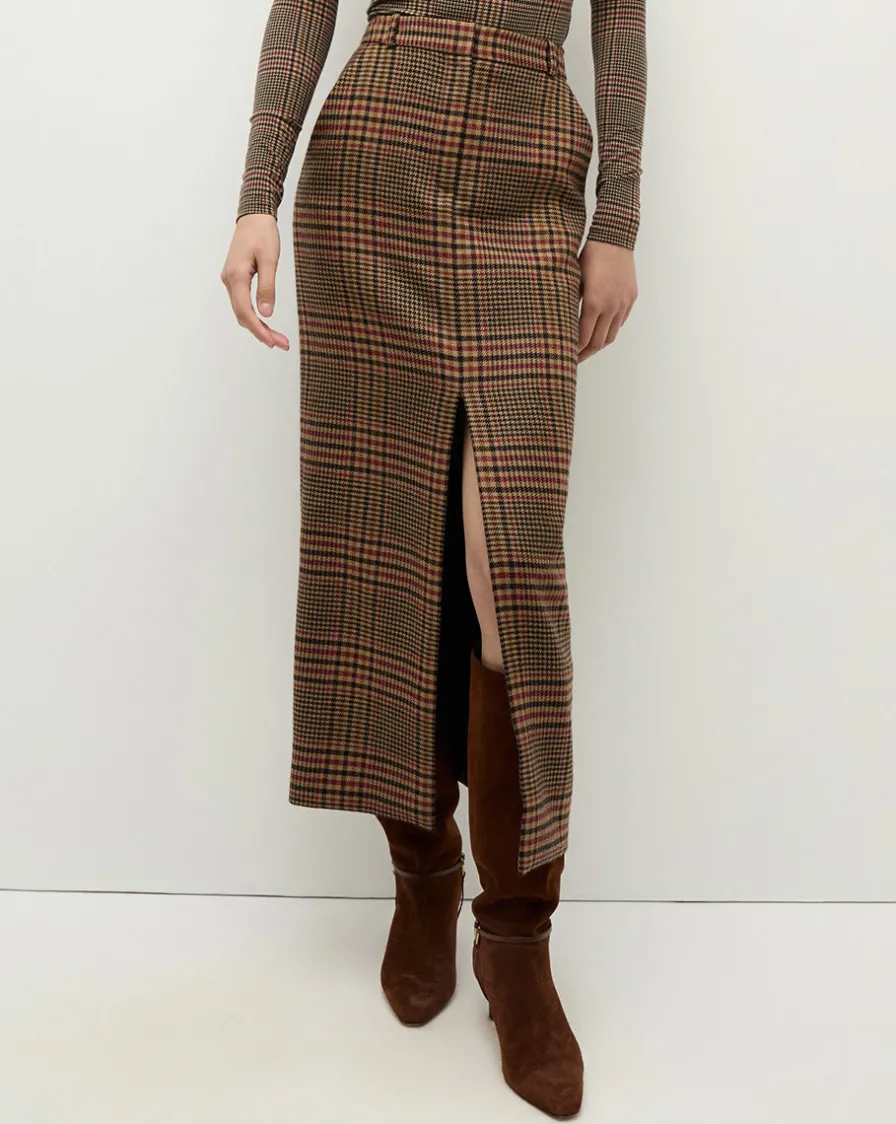 Expertly tailored from pure Italian virgin wool, the Maxine is a streamlined maxi skirt in classic, fall-friendly plaids.