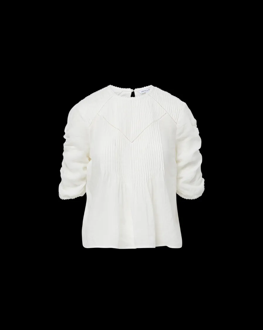 A classic black top with distinctly VB details—like ruched sleeves, pintucked pleats and ladder embroidery.