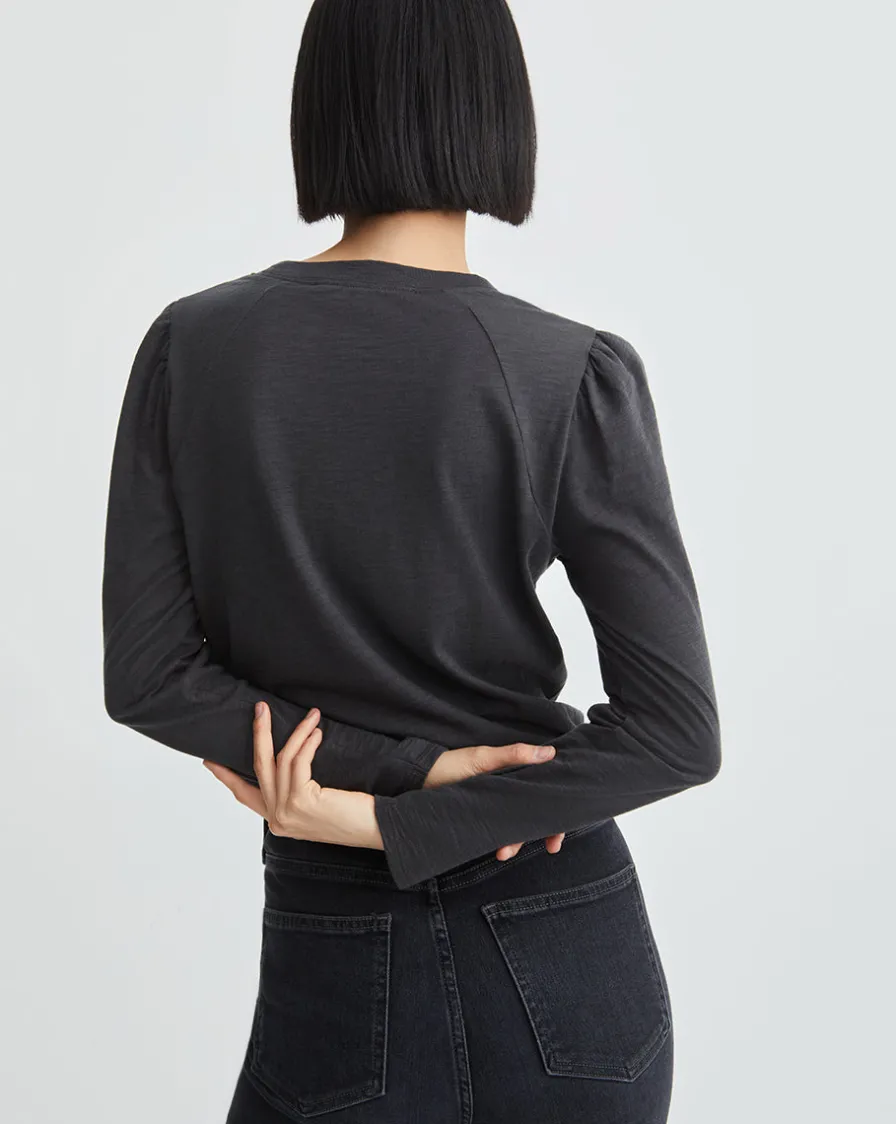 Our carefree Mason tee features puffed shoulders and a relaxed fit.