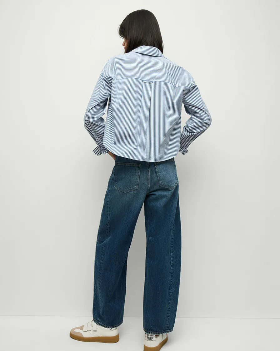 Veronica Beard Tops>Khai Cropped Tunic Top in Blue/White Stripe