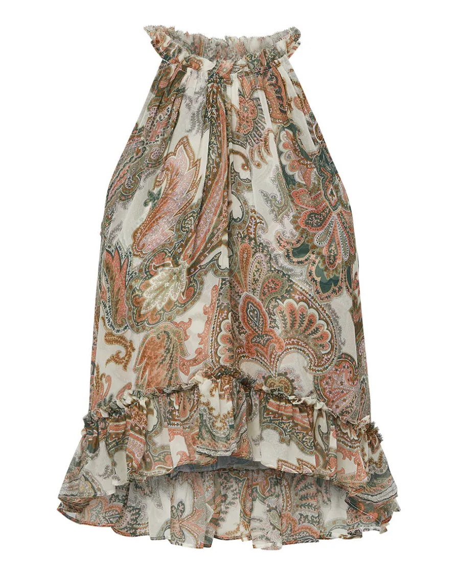 Crafted from 100% silk georgette, the Renee tank is splashed with a painterly paisley pattern that echoes the easy mood of the season.